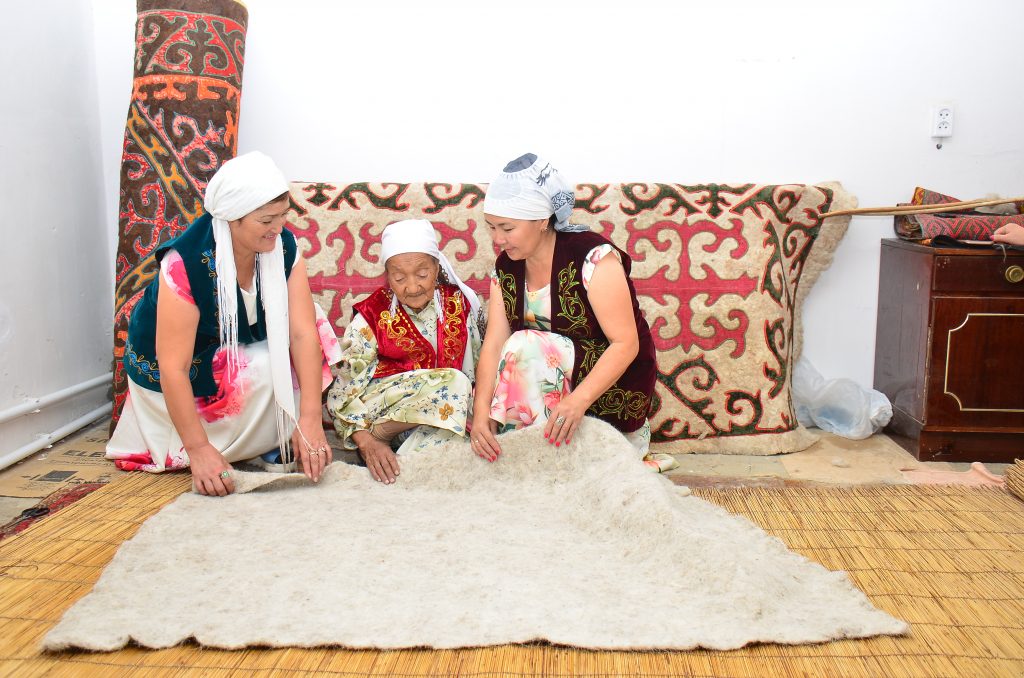 -Бұрын киіз басу кішігірім той іспетті өтетін. Ауылдың қыз-келіншектері мен апа-әжелері асарлатып, белсене кірісетін. Қазан қазан су қайнатып, келіндер жағы үлкен қазанға ет асып, апа-әжелер өлең айтып, өздерінің жақсы көңіл-күйлерімен жасайтын. Киіз басу ауыл тұрғындарын ынтымақ пен бірлікке шақыратын керемет дәстүр болатын. Мұндайда барлығы да бір үйдің баласындай қызмет етуші еді. Киіз басқан жерге ер адамды кіргізбейтінбіз. Себебі үлкендер «киіздің басы бірікпей қалады» деп ырымдайтын, — дейді әжей.