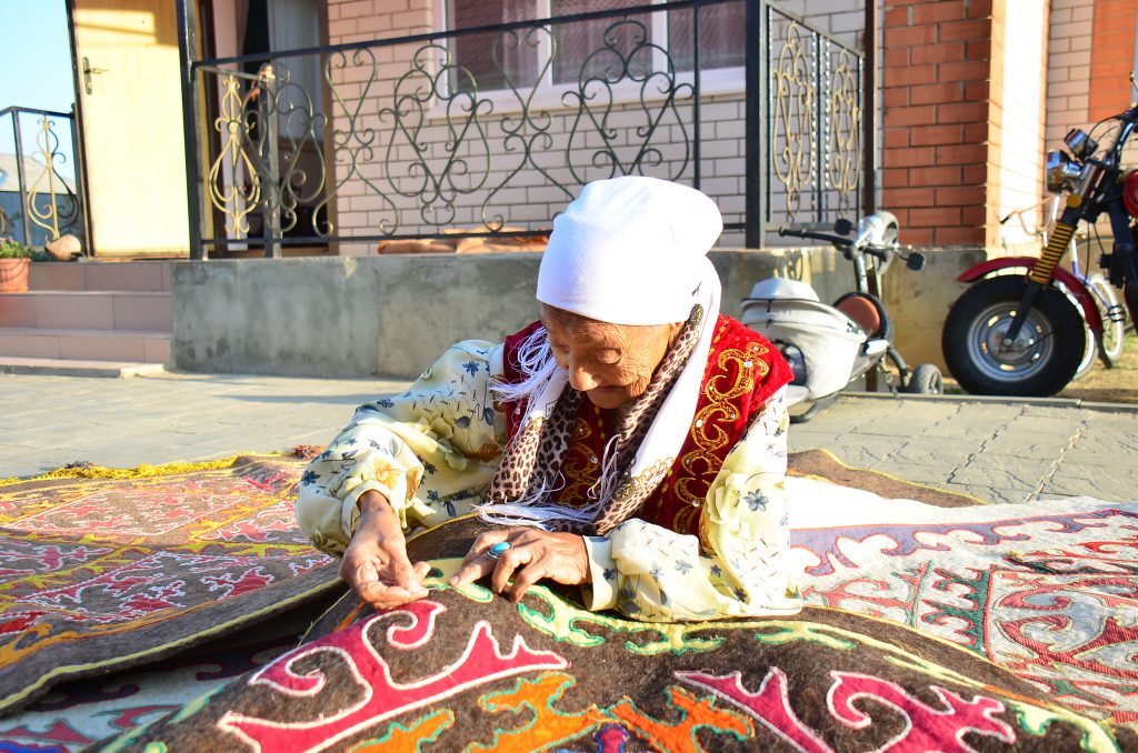 Мен текеметтеріме қошқар мүйіз, сынық мүйіз сынды оюларды саламын. Кейде балаларымның атын жазып сәндеймін. Қазір солардың кейбірі бар, бірақ басым бөлігі ескіріп қалды. Үйдегі киіздерімді жинап қойдым, — деді ол.