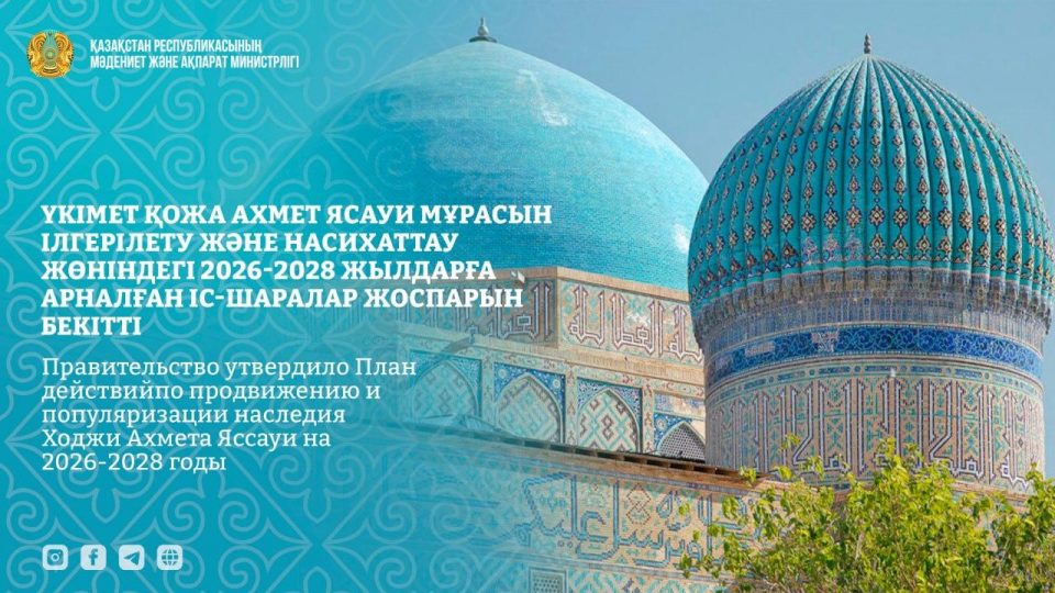 Қазақстан Республикасының Үкіметі Қожа Ахмет Ясауи мұрасын ілгерілету және насихаттау жөніндегі 2026-2028 жылдарға арналған іс-қимыл жоспарын бекітті. Тиісті қаулыға Премьер-министр Олжас Бектенов қол қойды.