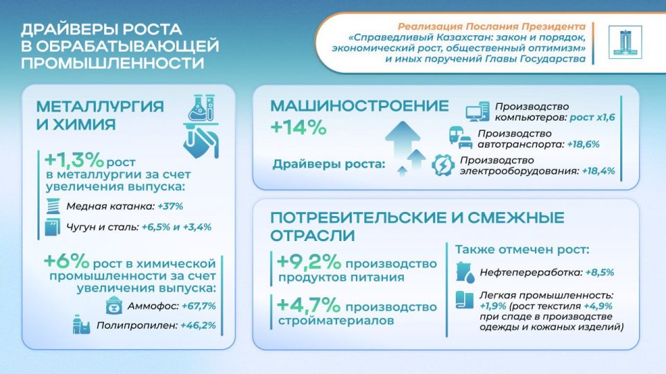 Драйверами роста стали приоритетные отрасли, такие как автомобилестроение, показавшее рост на 14%. Положительная динамика также зафиксирована в металлургии (+1,3%), химической промышленности (+6%) и производстве строительных материалов (+4,7%), что говорит о комплексной индустриализации экономики.