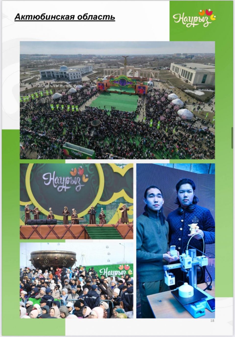 Актюбинская область представила масштабное технологическое переосмысление весеннего праздника. В регионе установили рекордные 399 тематических юрт и провели 350 мероприятий, которые вживую посетили более 250 тысяч человек. Онлайн-аудитория празднования превысила полмиллиона пользователей. Визуальный облик городов дополнили 235 баннеров и LED-экранов, а 16 уникальных цифровых решений позволили гостям погрузиться в традиции через дополненную реальность. В праздничных концертах приняли участие 200 артистов, включая Жанар Айжанову, Айгуль Иманбаеву и группу «Тамсан».